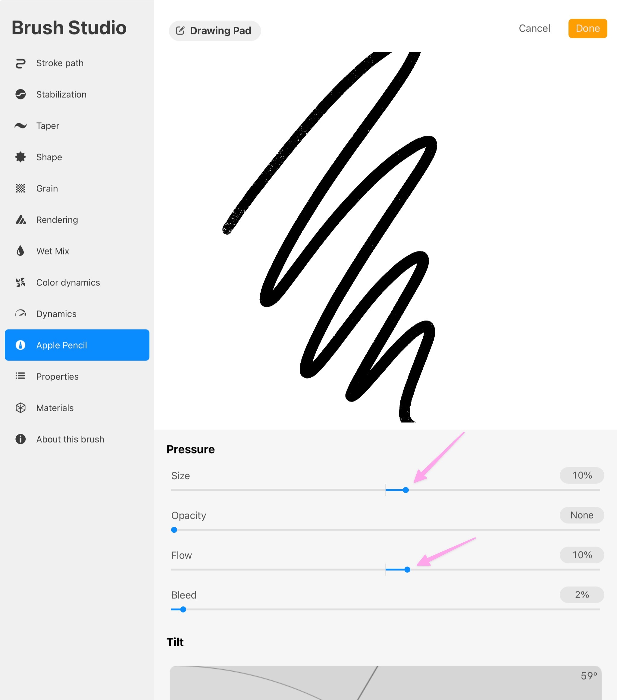 If you have access to a pressure-sensitive Apple Pencil (1st, 2nd gen and Pro version), give it a try, you’ll likely notice a big difference in how the brush behaves!